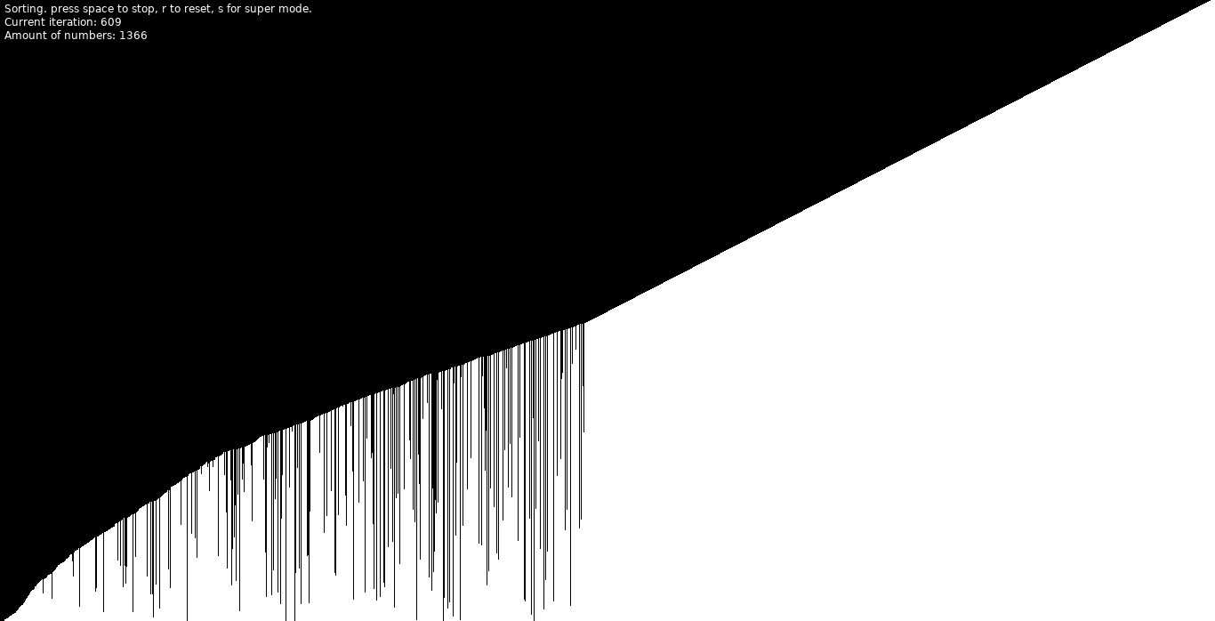 A while ago I was interested in sorting algorithms so I made this little program that shows a sorting algorithm in real time. It's written in lua and uses the LÖVE framework to render the window and algorithm.