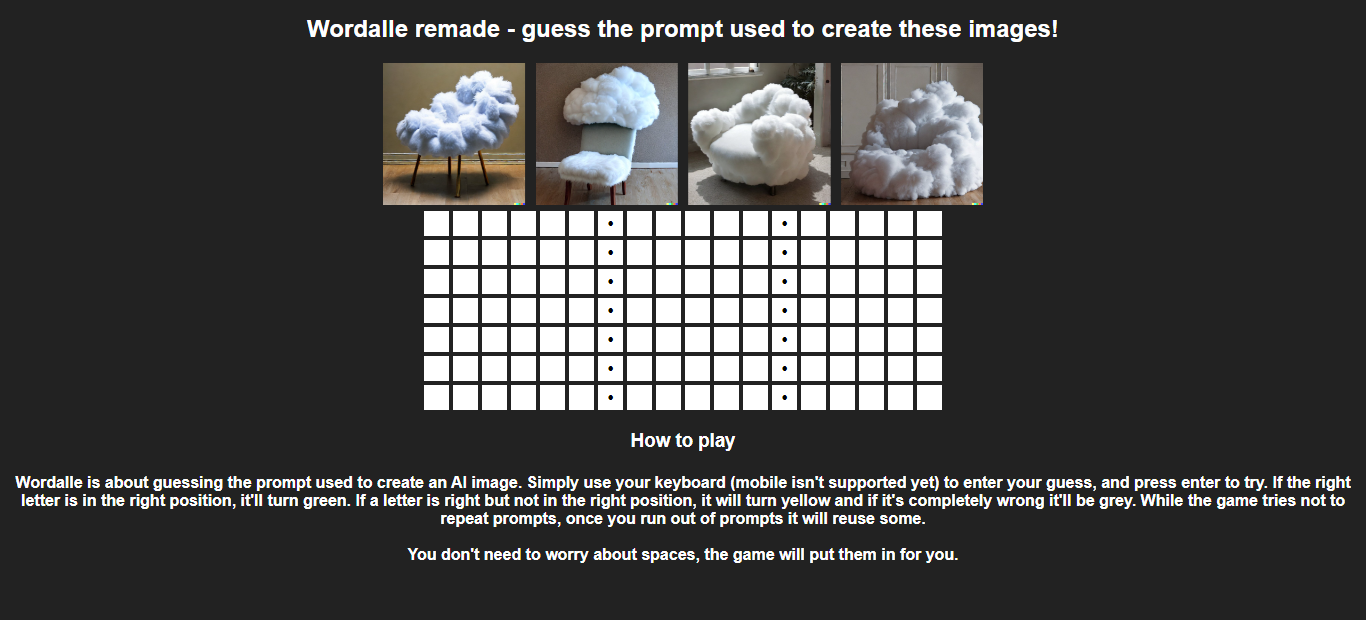 About a year ago I found out about wordalle and thought it was a really neat idea. Now, a year later, and it hasn't been updated for several months so I decided to remake it with new prompts. I asked chatgpt for ideas of prompts and used DALL-E 2 to create the images. The project mostly uses javascript with a small hint of html and css mixed in.